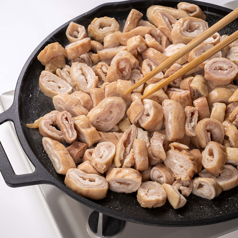 소개 전통 삶는 방식으로 1차 초벌하여 식품의 쫄깃함과 고소함을 살리고 컷팅으로 마무리하여 소비자가 더욱 쉽게 어디서든 막창을 먹을 수 있도록 제조한 초벌 막창